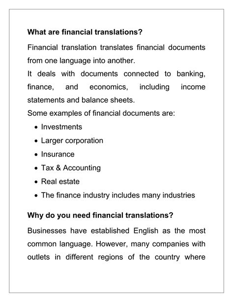 • Legal and Regulatory Compliance: Financial documents often have legal implications. Accurate translations are essential for ensuring compliance with international laws and regulations. Consider annual reports, tax filings, and regulatory submissions. Incorrect translations in these documents can lead to penalties, fines, and legal challenges. It’s not just about understanding the words; it’s about understanding the legal weight they carry. Therefore, it’s crucial to have a deep understanding of both the financial concepts and the legal frameworks involved.