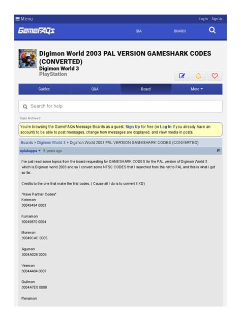 Remember, these are just examples. There are tons of codes out there, and the best way to find them is to search online forums and communities dedicated to Digimon World 2 and GameShark. This is the place where you can find other users who have the same interests.