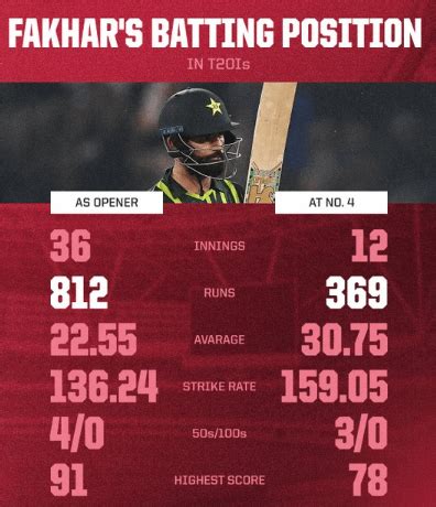 • Team Strategy: The team’s management often has a specific game plan that dictates the batting order. If the strategy is to maximize the powerplay overs, Fakhar will likely open the innings. Alternatively, if the team aims to build a solid foundation before accelerating later, he might be held back for a middle-order role. Understanding the team’s strategy is crucial in predicting Fakhar’s batting position.