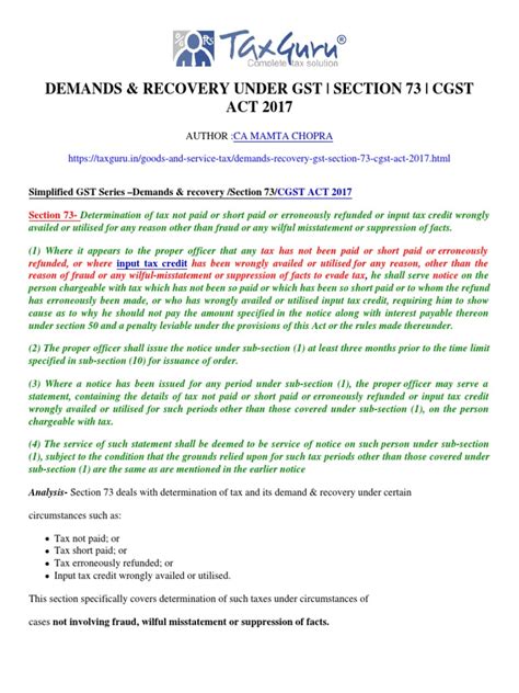 What’s up, guys! Today we’re diving deep into a super important part of the Goods and Services Tax (GST) law in India: Section 73 . This section is all about how the tax authorities can demand and recover tax that hasn’t been paid, or has been wrongly refunded, or where the input tax credit was wrongly availed. It’s a pretty crucial section because it lays out the procedures and the timelines that the tax officers have to follow. So, if you’re a business owner, a tax professional, or just someone trying to get a handle on GST, understanding Section 73 is key to staying compliant and avoiding unnecessary headaches. We’ll break down what it means, why it’s important, and how it works in practice. Get ready to demystify Section 73!