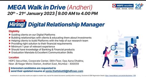 Okay, you’ve got the skills and qualifications, now it’s time to nail that interview for the Digital Relationship Manager role at HDFC Securities! First things first, do your research . Know everything you can about HDFC Securities, their products, their services, and their values. Understand the current market trends and be prepared to discuss them intelligently. Next, practice your answers . Think about common interview questions like “Why do you want to work for HDFC Securities?” or “Tell me about a time you had to deal with a difficult client.” Prepare your answers in advance, but don’t just memorize them word for word. You want to sound natural and authentic. Also, highlight your digital skills . Since this is a Digital Relationship Manager role, emphasize your experience with digital tools and platforms. Be ready to talk about how you’ve used technology to build relationships, acquire clients, and manage portfolios. Showcase your sales and communication skills . Give examples of how you’ve successfully persuaded clients, resolved conflicts, and explained complex financial concepts. Prepare some questions to ask the interviewer . This shows that you’re engaged and interested in the role. Ask about the team, the challenges, and the opportunities. Finally, dress professionally and be on time . First impressions matter, so make sure you look the part and arrive a few minutes early. Remember to be confident, enthusiastic, and genuine. Good luck!