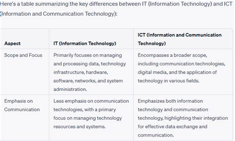 • Focus: IT focuses on the technical aspects of data management, storage, and processing. ICT emphasizes the use of technology for communication, collaboration, and information sharing.
