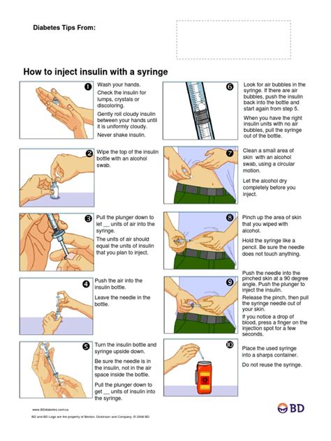 Alright, so you’ve got your insulin and your gear ready. The next big step is preparing for your injection . This phase is all about making sure the injection is safe, clean, and as comfortable as possible. First things first: hand hygiene! Washing your hands thoroughly with soap and water is non-negotiable. Seriously, guys, this is probably the most important step to prevent infections. Get them good and clean before you touch anything related to your injection. Once your hands are squeaky clean, it’s time to get your insulin ready. If you’re using an insulin vial, visually inspect it. Does the insulin look clear and colorless (for regular insulin) or cloudy (for NPH or pre-mixed insulin)? If it looks different from usual – like it has particles or a strange color – don’t use it. Toss it and grab a fresh one. Remember to roll cloudy insulin gently between your palms to mix it; never shake it vigorously, as this can create tiny bubbles and damage the insulin. If you’re using a pre-filled pen, give it a once-over too. Check for any clumps or discoloration. If you’re using a new pen or haven’t used it for a few days, you need to prime it. This involves attaching a new pen needle, dialing up about 2 units of insulin, and pointing the needle up. Then, press the injection button and let the insulin flow out. You should see a small stream of insulin. This process removes any air bubbles from the pen and needle, ensuring you get the correct dose of insulin. If you don’t see insulin, repeat the process. For syringes, after drawing up your insulin, you might need to tap the syringe gently to get any air bubbles to rise to the top, then push the plunger slightly to expel the air. Preparing for your injection also involves choosing your injection site. Common spots include the abdomen (about two inches away from the belly button), the thighs, the upper arms, and the buttocks. It’s super important to rotate your injection sites. This means not injecting in the exact same spot every time. Why? Because injecting repeatedly in the same place can lead to lipohypertrophy – a thickening or hardening of the fatty tissue under the skin – which can affect how well your insulin is absorbed. So, pick a spot, but remember to vary it each time. Once you’ve chosen your site, clean it with an alcohol swab. Wipe the area in a circular motion and let it air dry completely. Don’t blow on it or wave your hand over it; let the alcohol evaporate on its own. This step is vital for preventing infection. Finally, make sure you have your sharps container nearby, ready for safe disposal of the used needle immediately after your injection. Being meticulous in this preparation phase sets you up for a successful and safe insulin administration every single time.