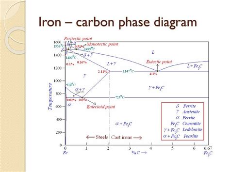 - Eutectic Point: This point occurs at 1147°C (2090°F) and 4.3 wt% carbon . Here, liquid metal transforms directly into austenite and cementite upon cooling. This is important for understanding the solidification of cast irons.