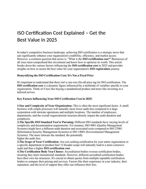 Now, let’s talk about factors that can influence the price of ISO certification , guys. When you’re looking at that ISO cost PDF, you might be wondering why one quote is higher or lower than another. Well, a few key elements come into play. First and foremost, the size of your organization is a massive driver. A small startup with 10 employees is going to have a different cost structure than a multinational corporation with thousands of staff spread across multiple locations. More employees generally mean more systems to audit, more documentation to review, and a longer audit duration, all of which translate to higher costs. Secondly, the complexity of your operations is a big deal. If your business has straightforward processes, the audit will be simpler and quicker. However, if you’re in a highly regulated industry, have intricate supply chains, or operate in multiple technical domains, the audit will naturally be more involved and thus more expensive. The specific ISO standard you’re pursuing also impacts the price. Some standards, like ISO 9001 (Quality Management), are very common and have well-established audit methodologies. Others, like ISO 45001 (Occupational Health and Safety) or ISO 14001 (Environmental Management), might require specialized auditors and more in-depth assessments, potentially increasing the cost. The chosen certification body is another significant factor. Different accredited bodies have varying fee structures. Some might be more competitive on price, while others focus on offering specialized expertise or a more comprehensive service. It’s always a good idea to get multiple quotes from reputable certification bodies to compare. The level of existing documentation and your internal processes also play a role. If your company already has robust documented procedures and a well-functioning management system, you might require less consultancy and fewer auditor days, potentially lowering the cost. Conversely, if you’re starting from scratch, the investment in implementation and auditing will be higher. The scope of certification is also critical. Are you seeking certification for your entire organization, or just a specific department or location? A broader scope naturally increases the audit effort and cost. Lastly, the location of your business can sometimes influence costs, especially if auditors need to travel long distances. The ISO cost PDF should ideally reflect these variables. A good quote will clearly state the assumptions made regarding your organization’s size, complexity, and scope. Don’t be afraid to ask for clarification if certain elements aren’t clear. Understanding these influencing factors will help you interpret the ISO cost PDF accurately and negotiate the best possible deal for your business. It’s about finding that sweet spot between cost and value, ensuring you get a certification that truly benefits your operations!