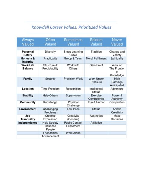 To really maximize the benefits of the Knowdell Career Values Card Sort , here are a few extra tips to keep in mind. First, be honest with yourself . This is probably the most important tip. The card sort is only as effective as your honesty. Don’t try to choose values that you think you should have or that would impress others. Focus on what truly matters to you, even if it’s not what you expect. Next up, take your time . Don’t rush through the sorting process. Set aside enough time to really reflect on each value and how it relates to your career aspirations. It’s better to spend a few hours doing a thorough job than to quickly sort the cards without much thought. Another great tip is to consider past experiences . Think about times when you felt particularly satisfied or dissatisfied in your work. What values were being met or unmet in those situations? Reflecting on your past experiences can provide valuable insights into your core career values. Also, don’t overthink it . While it’s important to be thoughtful, don’t get too caught up in analyzing every single value. Trust your gut and go with your initial reactions. Sometimes the first instinct is the most accurate. Remember to revisit your values regularly . Your career values may evolve over time as you gain new experiences and perspectives. Revisit your card sort periodically to ensure that your career is still aligned with your core values. It’s a good idea to do this at least once a year or whenever you’re facing a major career decision. Finally, seek professional guidance . If you’re struggling to interpret your results or develop a career plan, consider working with a career counselor. A counselor can provide valuable insights and support as you navigate your career journey. So, there you have it – be honest, take your time, consider past experiences, don’t overthink it, revisit your values regularly, and seek professional guidance. These tips will help you get the most out of your Knowdell Career Values Card Sort experience and create a more fulfilling and successful career.