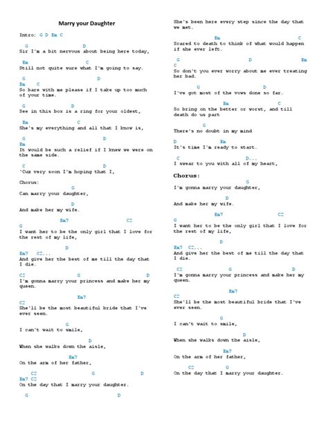 Remember to practice transitioning smoothly between these chords. The key to making this song sound good is clean chord changes and a steady rhythm. Don’t rush; focus on getting each chord to ring out clearly before moving to the next. We’ll explore the specific order and timing in the next sections, but having these shapes down cold is your first major step. Keep practicing those chord changes until they feel natural, and you’ll be well on your way to playing “Marry Your Daughter” beautifully.