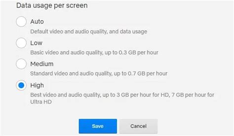 • High: This delivers the best picture quality, including HD and sometimes even 4K, depending on your subscription plan and device. This is the data hog, using up to 3 GB per hour or more for 4K content.