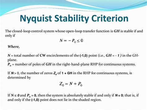 5. Apply the Nyquist Stability Criterion : The core of the criterion is the formula: Z = N + P. Where Z is the number of unstable closed-loop poles, N is the number of encirclements of the (-1, 0) point, and P is the number of unstable open-loop poles. If Z = 0, the closed-loop system is stable. If Z is greater than 0, the closed-loop system is unstable. Therefore, a closed-loop system is stable if and only if the number of unstable closed-loop poles (Z) is zero. When Z = 0, the system is stable, meaning it won’t oscillate uncontrollably. This is what you’re aiming for. This systematic method provides a clear path to assessing system stability. This approach enables engineers to systematically evaluate stability. This is the cornerstone of control system analysis, providing a definitive answer to the stability of the system.