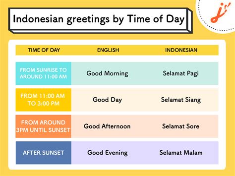 Now, let’s level up your greeting game by learning the time-of-day greetings. These are super important and commonly used by Indonesians. They show you’ve put in a little extra effort, and that goes a long way! First up, for the morning, you’ve got ‘Selamat Pagi’ . This literally translates to ‘safe morning’, and you use it from sunrise until around 10 or 11 AM. It’s the perfect way to start your day when interacting with anyone. Imagine walking into a local warung (small restaurant) for breakfast; a cheerful ‘Selamat Pagi!’ will definitely get you a smile. Next, we have ‘Selamat Siang’ . This is used from around 10 or 11 AM until about 3 PM. ‘Siang’ means ‘daytime’, so it’s a ‘safe day’. This is great for lunchtime greetings or if you’re visiting places in the early afternoon. ‘Selamat Sore’ comes next, typically used from 3 PM until sunset, around 6 or 7 PM. ‘Sore’ refers to the afternoon/early evening. So, you’d use this when you’re finishing up your day’s activities or meeting someone for an early evening chat. Finally, for the evening and night, we use ‘Selamat Malam’ . ‘Malam’ means ‘night’. You use this from sunset onwards. This is your greeting for when it’s dark outside, perfect for saying hello at dinner or if you’re out and about after dark. The word ‘Selamat’ itself means safe, well, or prosperous, so essentially you’re wishing the person well for that particular part of the day. It’s a beautiful sentiment, isn’t it? Using these greetings correctly shows respect for the local culture and customs. It’s not just about the words; it’s about the intention behind them. So, try to remember these: Pagi (morning), Siang (daytime), Sore (afternoon), and Malam (night). Practice saying them out loud. Selamat Pagi! Selamat Siang! Selamat Sore! Selamat Malam! See? Not too hard, right? These will make you sound way more natural and integrated than just sticking to ‘Halo’ all the time. Plus, it’s a fantastic conversation starter. People often respond positively when you make an effort to use their language, even just for a simple greeting. So, go ahead, impress your friends and locals alike with your newfound knowledge of Indonesian time-of-day greetings! It’s a small step that makes a big difference.