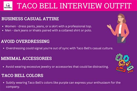 First impressions matter, guys! While Taco Bell is a casual workplace, you should still dress neatly and professionally for your interview. Think clean, wrinkle-free clothes. Good options include: