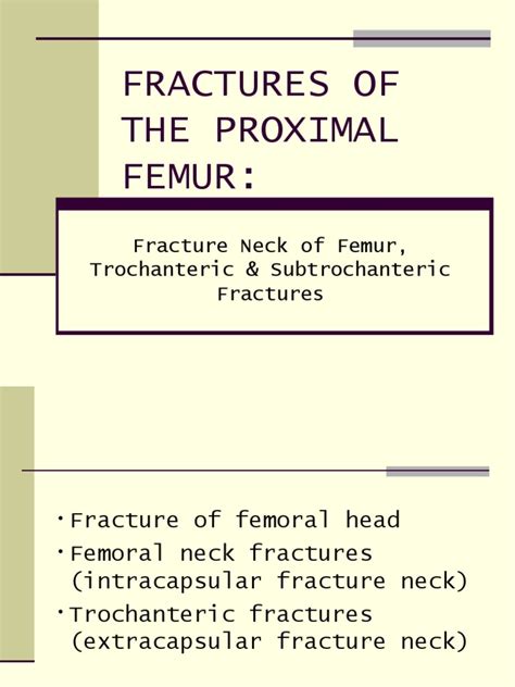 Alright, so when we talk about proximal femur fractures, it’s not just one single type of break, guys. The upper part of your femur is pretty complex, and the fracture can occur in different spots, which is why doctors categorize them. Understanding these categories is super important because it dictates how the injury is treated. The most common types we see are femoral neck fractures and intertrochanteric fractures . Femoral neck fractures happen right below the ball of the hip joint, in the narrow part of the bone called the neck. These can be tricky because the blood supply to the femoral head runs through the neck, and a fracture here can sometimes disrupt that blood flow, potentially leading to avascular necrosis (where the bone tissue dies due to lack of blood). These are often further classified into undisplaced, partially displaced, and displaced fractures, with displaced ones generally requiring more aggressive treatment. Then we have intertrochanteric fractures . These breaks occur in the area between the greater and lesser trochanters, which are the two bony prominences on the upper femur where major muscles attach. These fractures are typically more stable than femoral neck fractures because they’re in a thicker part of the bone and often have better blood supply. They’re usually caused by more direct impact or falls. Another less common type is a subtrochanteric fracture , which happens a bit lower down, in the shaft of the femur just below the lesser trochanter. These fractures can be more challenging to manage due to the strong forces from the muscles attached in that region. Sometimes, you might also hear about femoral head fractures , which involve the actual ball of the hip joint. These are usually associated with significant trauma, like a car crash, and often occur along with dislocations of the hip. The classification system used by orthopedists, like the Garden classification for femoral neck fractures or the AO/OTA classification for all types, helps them precisely describe the fracture pattern. This detailed understanding is absolutely critical for surgeons when planning the best course of action. It’s like giving them a roadmap to fix the bone. Each type has its own set of challenges and implications for recovery, so knowing the difference is key to understanding the patient’s journey. Don’t get too bogged down in the classifications themselves, but grasp that the location and pattern of the break significantly influence treatment and prognosis. It’s all about pinpointing the exact issue to provide the most effective fix.