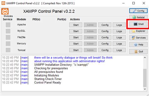 - Using the Shell: The Control Panel also includes a “Shell” button, which opens a command-line interface (CLI) with the XAMPP environment loaded. This allows you to run commands directly on the server, such as PHP scripts or MySQL queries. This is especially useful for advanced users who prefer working with the command line.