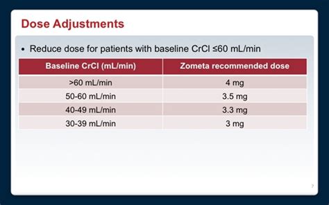 Okay, let’s talk about the practical side of Zometa – how it’s dosed and administered. This is important stuff, so pay close attention! As we mentioned earlier, Zometa is given as an intravenous (IV) infusion. This means the medication is delivered directly into your vein. The dosage and how often you receive the infusion depend on what you’re being treated for and your overall health. For bone metastases, the usual dose is typically 4 mg, administered every 3 to 4 weeks. However, your doctor will adjust this based on factors like your kidney function. For hypercalcemia of malignancy, the dosage might be different, and the frequency can vary depending on how quickly the calcium levels in your blood need to be brought under control. If you have osteoporosis, Zometa might be given less frequently, sometimes once a year.